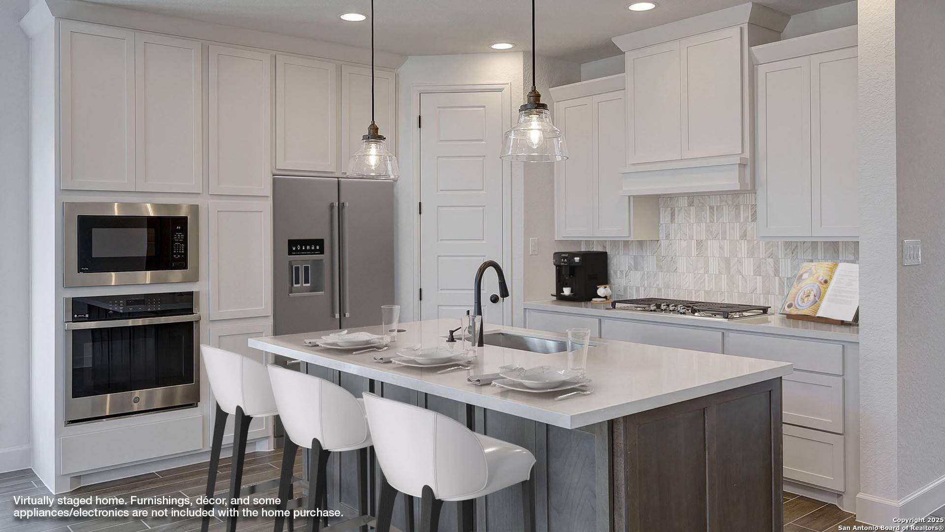 Home office with French doors and 11-foot ceiling set at two-story entry. Open kitchen features deep walk-in pantry, 5-burner gas cooktop and generous island with built-in seating space. Dining area opens to two-story family room with a wood mantel fireplace and wall of windows. Primary suite includes bedroom with 10-foot tray ceiling. Double doors lead to primary bath with dual vanity, freestanding tub, separate glass-enclosed shower and large walk-in closet. An additional bedroom is downstairs. Secondary bedrooms and game room with 10-foot tray ceiling are upstairs. Covered backyard patio. Mud room off two-car garage.