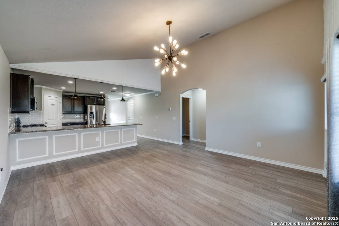 Stunning 4-bedroom, 3-bath, 2,323 sq ft two-story home built in 2018 and located on the South Side of San Antonio with exceptional upgrades throughout! This beautifully maintained property features upgraded laminate flooring, crown molding on the main level, decorative trim, window casings, stairwell trim, dining room chair rail, and elegant custom finishes that truly set it apart. The open-concept kitchen is loaded with upgrades including upgraded tile backsplash, extended cabinetry over the refrigerator, under-cabinet LED lighting, lower cabinet light valance, island pendant lighting, decorative island trim, and an externally vented kitchen exhaust fan. The spacious living and dining areas are perfect for entertaining. Primary suite offers a private retreat with added over-toilet cabinetry. Secondary bathrooms also include upgraded over-toilet storage. Laundry room includes added cabinetry for extra organization. The garage is a dream workspace with insulated garage door, mini-split AC/heat pump, LED lighting, additional electrical outlets, jumper panel, 240-volt plugs, and a 30-amp RV plug. Added walk-in garage door trim enhances the custom feel. Exterior features include a deck extension off the rear patio, smart irrigation controller, and protective screens on golf course-exposed windows for added comfort and efficiency. Energy-efficient construction helps keep utility costs low. Conveniently located near major highways, schools, shopping, dining, and military bases. Priced at $299,000, this home offers rare upgrades, space, and move-in-ready condition. Schedule your private showing today!